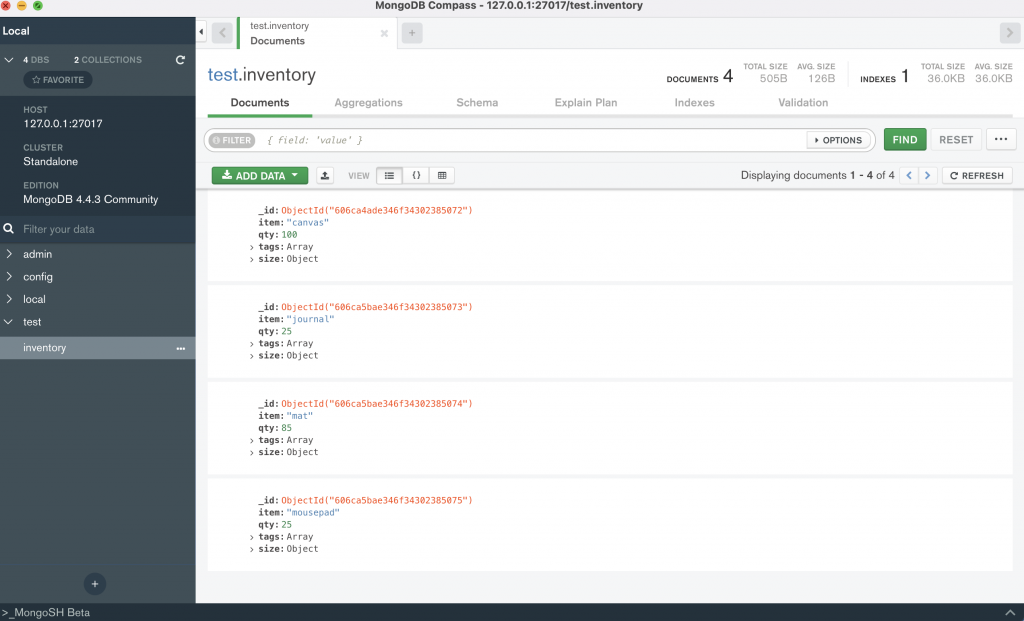 { "_id" : ObjectId("606ca4ade346f34302385072"), "item" : "canvas", "qty" : 100, "tags" : [ "cotton" ], "size" : { "h" : 28, "w" : 35.5, "uom" : "cm" } } |
